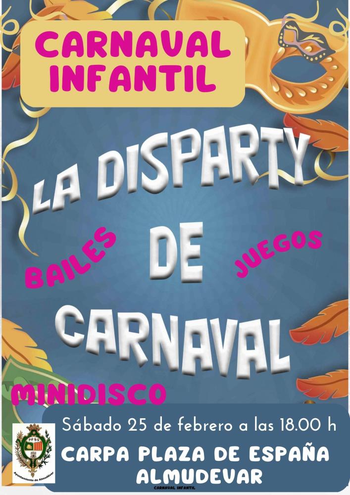 El carnaval comenzará a las 18.00 horas en la Carpa de la Plaza de España donde se celebrará la fiesta infantil Disparty de Carnaval con un show con bailes, juegos y canciones y Minidisco.