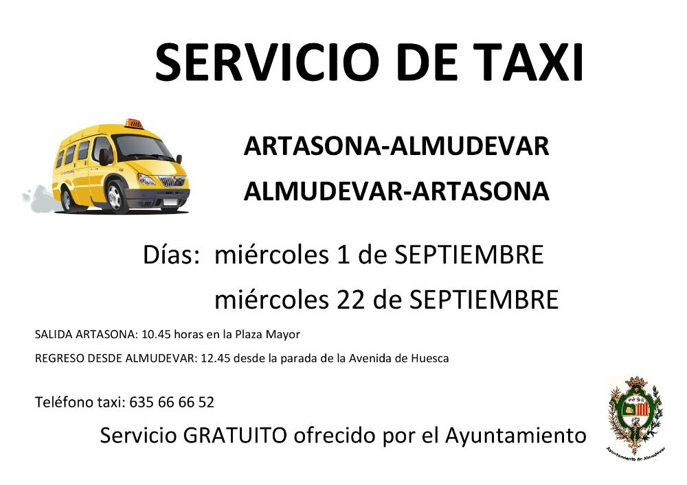 Se pone en marcha el servicio gratuito de transporte regular mediante taxi con el que se busca acercar y hacer más accesibles todos los servicios de que dispone Almudevar a los vecinos de los núcleos de Artasona del Llano, San Jorge y Valsalada (gestiones en el ayuntamiento, bancos, correos, farmacia, gestoría... así como para realizar compras en el comercio de Almudevar y el mercadillo de los miércoles).
