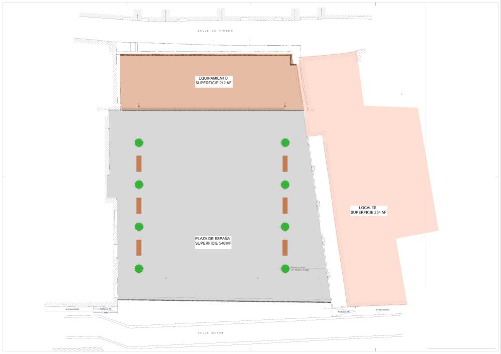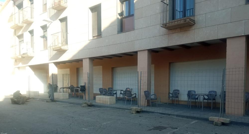 A este gran equipamiento de la plaza hemos sumado la reciente adquisición de los locales de los pisos de la c/ Mayor 56-58, con una superficie de 254 m2. El fondo de los locales se dedicará a vestuarios-camerinos, aseos y almacén de equipamiento de la plaza,. Y la parte delantera de los locales en la zona de los porches como dotación de un futuro equipamiento social y cultural para Almudévar.