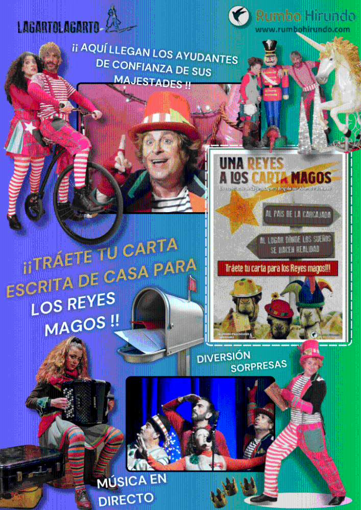 -Lunes 30 de diciembre a las 18.30 horas en el Centro Cultural: CARTERO REAL con el espectáculo UNA REYES A LOS CARTA MAGOS de LagartoLagarto dirigido por Alfonso Palomares.